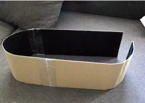 步驟2.用膠帶把從包裝盒上裁下的硬紙板長條粘在一起,做成一個長橢圓形的盆,保證這個面積剛好能夠在里面放上兩個小花盆。