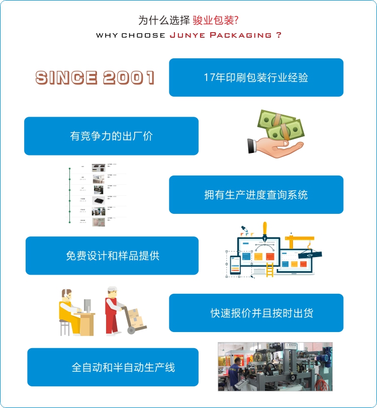 廣州駿業(yè)包裝實(shí)業(yè)有限公司創(chuàng)建于 2001年,是一家以印刷包裝制品為主營(yíng)業(yè)務(wù)的集設(shè)計(jì)、生產(chǎn)、銷售為一體的一般納稅企業(yè),主要生產(chǎn)各種精品包裝盒、紙袋、吊牌,其主要應(yīng)用于服飾、皮具、化妝品、保健品、禮品、首飾、茶葉、酒類、電子產(chǎn)品及其它日用制品等行業(yè),并通過了德國(guó)萊茵認(rèn)證、BV認(rèn)證、SGS認(rèn)證和WCA認(rèn)證.