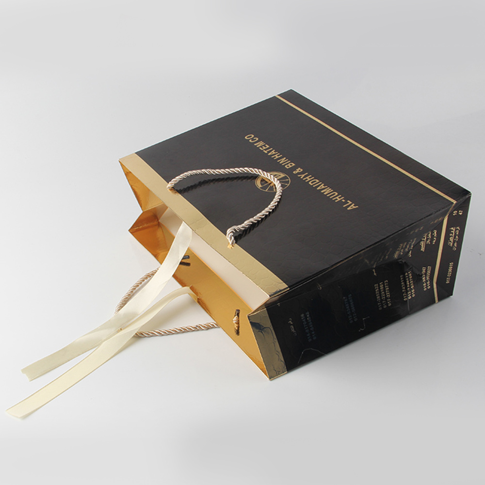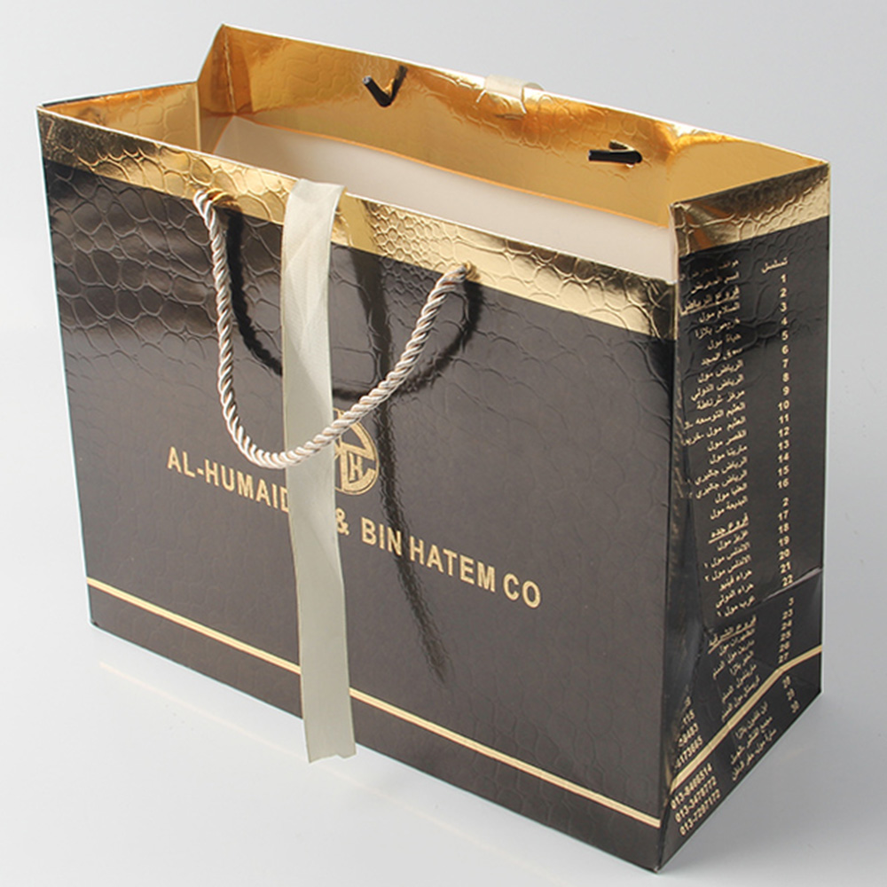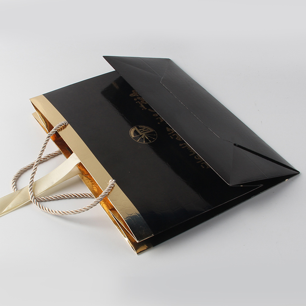 這位商家也很明白事理,知道這個(gè)工藝的難點(diǎn)是媲美得上是特種紙的操作難度,但是用簡(jiǎn)單的工藝來(lái)讓這個(gè)金卡紙達(dá)到準(zhǔn)特種紙的標(biāo)準(zhǔn),能夠有效地減少很多時(shí)間上的成本,一般特種紙需要額外的7天定做時(shí)間,但是皮具紙袋制造商在這個(gè)手挽袋訂做上面僅僅是將一個(gè)金卡紙,先進(jìn)行了印刷黑色再進(jìn)行覆膜,最后通過(guò)壓板添加這些類似鱷魚皮一樣的紋路,就成功地鍛造出這個(gè)圖中的皮具禮品袋了。
