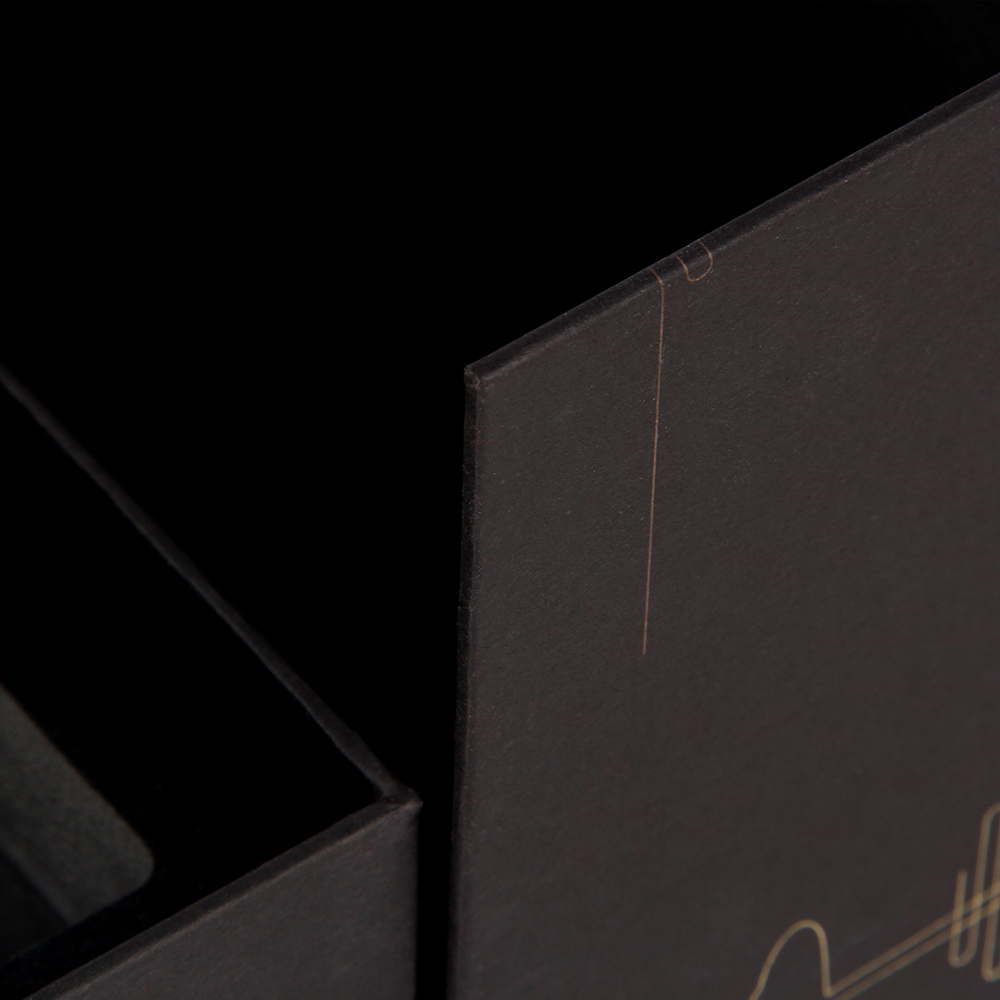最后工藝上的話,這款雙開包裝盒為了配合深色的裱紙,選擇的是燙印,燙印相較于UV等其他工藝有一個(gè)天然優(yōu)勢(shì),就是即便是用了特種紙表面凹凸不平,也有對(duì)應(yīng)的燙印材料用來(lái)適應(yīng),而UV等的工藝適應(yīng)力比較差,有時(shí)候沒辦法適應(yīng)不一樣的裱紙材料,所以建議是用燙印即可
