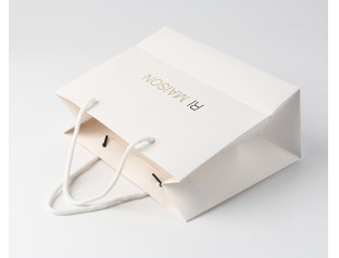此款紙袋制作加工采用了250g銅版紙,商標(biāo)燙金,過啞膠,提手處用尼龍自扣圓繩手提紙袋制作選用白色作為整體色,醒目燙金的LOGO居中,更彰顯其品牌價值。服裝紙袋制作采用白色尼龍圓繩,與整體紙袋風(fēng)格統(tǒng)一,想定制此款小清新手提紙袋,歡迎致電廣州駿業(yè)包裝廠